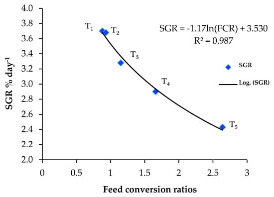 The survival rate of the fish was not affected significantly by the varying composition of feed. On the other hand, lower feed conversion ratios (FCR) were observed in T1 (0.89 ± 0.09) and T2 (0.93 ± 0.17). There was a significant difference of FCR between the fish fed with 25% (T2) and 50% supplementation of A. pinnata protein (T3) (p < 0.05). FCR increased gradually among the fish fed in treatments T3, T4, and T5 with greater proportions of the fresh plant. The highest FCR (2.64 ± 0.06) was noticed in fish fed at T5. FCR gradually worsened with the increasing replacement level of fresh Azolla. Thus, more than 25% of supplementary A. pinnata protein significantly increased the FCR of the fish during the culture period. There was a negative correlation between the SGR and FCR of the fish, with R2 = 0.987 (Figure 1).