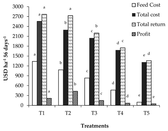 The costs and returns by providing fresh A. pinnata as a replacement of CFF in different treatments found in this study are depicted in Figure 2. The use of plant protein significantly affected the cost, return, and net profit rate in Thai silver barb production. A significant reduction of feed cost and, therefore, the total cost was seen in the treatments as a greater percentage of CFF was replaced with A. pinnata. The total return calculated from evaluating the market price of fish was 2767.35 ± 2.66 USD ha−1 56 days−1 and 2726.75 ± 3.45 USD ha−1 56 days−1 fish reared in T1 and T2, respectively, which was not significantly varied (p > 0.05). However, a significantly higher net profit of 431.49 ± 0.58 USD ha−1 56 days−1 is calculated for fish fed with 25% A. pinnata (T2) compared to the profit of 214.33 ± 0.18 USD for the fish fed totally with CFF (T1) for 56 days (p < 0.05). The net profit lowered gradually from the feeding treatments T3 to T5. The lowest net profit was calculated in fish produced with sole Azolla feed at T5 (46.97 ± 1.89 USD).