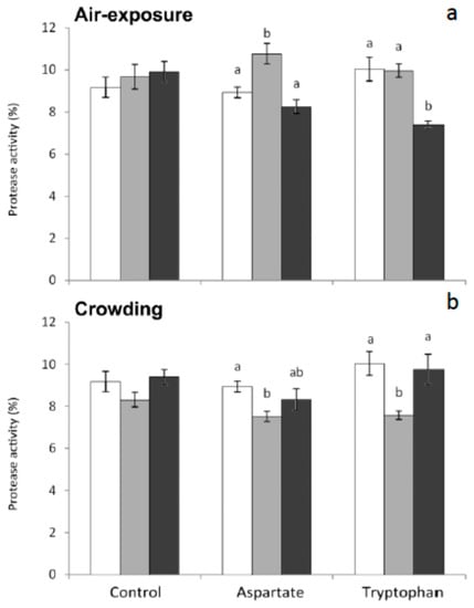 Protease activity (%) in fish stressed by (a) air-exposure or (b) crowding. Results are shown as mean ± standard error. Different letters indicate significant differences among non-stressed fish (white bars), 1 h post stress (grey bars) and 6 h post stress (black bars). Differences were considered significant when p < 0.05.