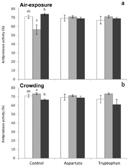 Antiprotease activity (%) in fish stressed by (a) air-exposure or (b) crowding. Results are shown as mean ± standard error. Different letters indicate significant differences among non-stressed fish (white bars), 1 h post stress (grey bars) and 6 h post stress (black bars). Differences were considered significant when p < 0.05.
