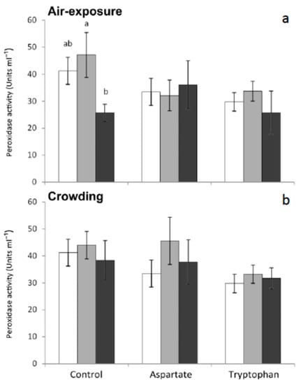 Peroxidase activity (units mL−1) in fish stressed by (a) air-exposure or (b) crowding. Results are shown as mean ± standard error. Different letters indicate significant differences among non-stressed fish (white bars), 1 h post stress (grey bars) and 6 h post stress (black bars). Differences were considered significant when p < 0.05.