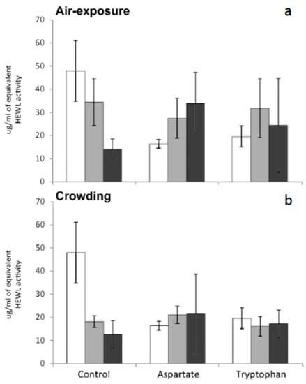 Lysozyme activity (μg mL−1 of equivalent hen egg white lysozyme activity) in fish stressed by (a) air-exposure or (b) crowding. Results are shown as mean ± standard error. Non-stressed fish (white bars), 1 h post stress (grey bars) and 6 h post stress (black bars). Differences were considered significant when p < 0.05.