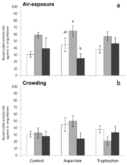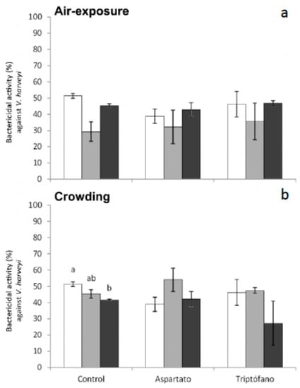 Bactericidal activity (%) against V. harveyi in fish stressed by (a) air-exposure or (b) crowding. Results are shown as mean ± standard error. Different letters indicate significant differences among non-stressed fish (white bars), 1 h post stress (grey bars) and 6 h post stress (black bars). Differences were considered significant when p < 0.05.