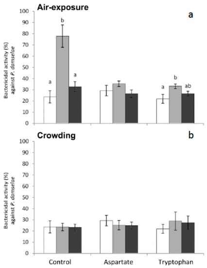 Bactericidal activity (%) against P. damselae in fish stressed by (a) air-exposure or (b) crowding. Results are shown as mean ± standard error. Different letters indicate significant differences among non-stressed fish (white bars), 1 h post stress (grey bars) and 6 h post stress (black bars). Differences were considered significant when p < 0.05.