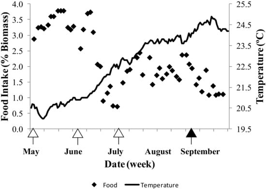 Temperature (solid line) and food intake (black rhombus) during the experimental period. White arrowheads in the X-axis indicate the GnRHa treatment and sampling times, and the black arrowhead indicates the final sampling time.
