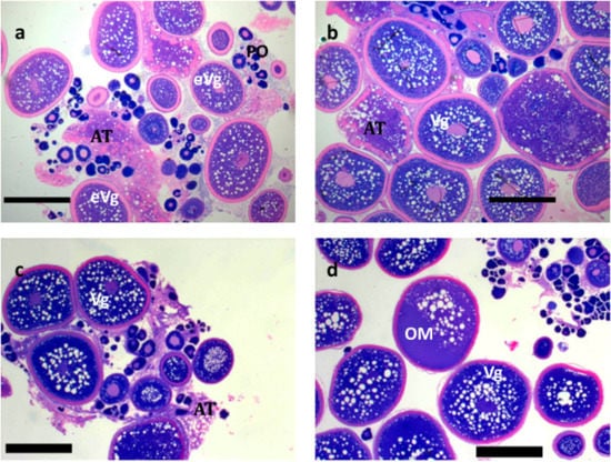 Almost one third of the females were in early vitellogenic stage (eVg) in May (Figure 2a), but mostly the fish (n = 4) had fully vitellogenic (Vg) oocytes (Figure 2b), with a mean (±Standard Error of the Mean, SEM) diameter of the largest oocytes of 685 ± 21 μm (Figure 3). Some atresia (AT) was present, as well. Only females with oocytes >600 μm were considered eligible for spawning after GnRHa implantation. In June, four of the biopsied females again had mainly Vg oocytes, but also oocytes in maturation, with the largest oocytes having a mean diameter of 723 ± 47 μm (Figure 3), with also some AT. At the same sampling, one female was found with ovulated eggs. In July, three of the females had Vg oocytes (Figure 2c) in the ovary, with an increased percentage of AT. The mean diameter of the largest Vg oocytes was 697 ± 26 μm (Figure 3). The rest of the females had mainly ovulated eggs and primary or eVg oocytes at most. At the last sampling in September, most of the females (n = 4) were in Vg stage with a mean diameter of 650 ± 37 μm (Figure 3). Two of them had oocytes in OM (Figure 2d). No significant differences were found in the mean diameters of the largest Vg oocytes among the different samplings.