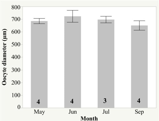 Mean (±Standard Error of the Mean, SEM) oocyte diameter of F1 greater amberjack (n inside the bars) that were expected to respond to given GnRHa implant, at the time of treatment (May–July) and at the conclusion of the experiment (September). No statistically significant differences were observed (p < 0.05).