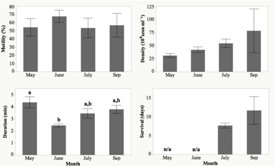 Mean sperm motility was >50% (Figure 4) and remained unchanged throughout the monitored period, while the duration of sperm motility was significantly higher in May (4.35 ± 1.12 min) than in June (2.44 ± 0.24 min) (p < 0.05). The mean sperm density was 30.8 ± 6.8 × 109 spermatozoa mL−1 in May and 78.0 ± 72.2 × 109 spermatozoa mL−1 in September, although with elevated individual variability in September (Figure 4).