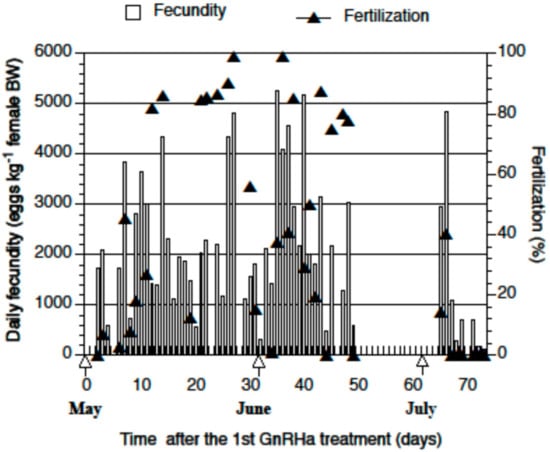 The highest daily relative fecundity that was recorded was 5539 eggs kg−1 fish after the second GnRHa treatment (Figure 5), but the total egg production was higher after the first treatment; that is, 60,540 eggs kg−1 fish compared to 40,180 eggs kg−1 fish after the second treatment (Table 3). No significant differences were found in daily relative fecundity among the three treatment periods. Almost 15 million eggs were produced from the three successive GnRHa applications.