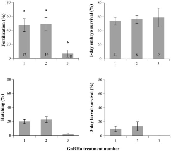 Mean fertilization changed through the spawning period after each treatment, reaching its highest values after the first and the second GnRHa treatment, while a significant decrease was observed after the third treatment (p < 0.05) (Figure 6). On the other hand, no significant differences were observed in hatching, one-day embryo survival and three-day larval survival after successive GnRHa treatment. Regression analysis showed a significant correlation between fertilization success and number of daily fecundity (Figure 7a,b). However, one-day embryo survival correlated significantly with daily egg production (Figure 7a) and not with the number of spawns (data not shown), while hatching success showed the opposite trend (Figure 7b).