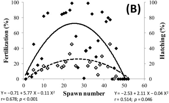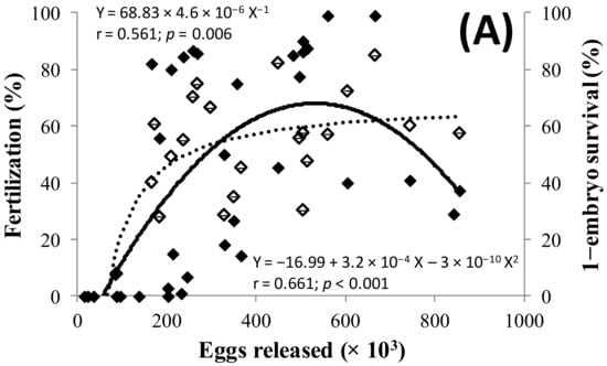 Fertilization (solid rhombus) and one-day embryo survival (open rhombus) in relation to daily egg released (A), and fertilization (solid rhombus) and hatching success (open rhombus) in relation to number of spawn (B).