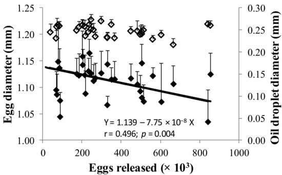 The diameter of the eggs ranged from 1.035 to 1.165 mm, with a mean of 1.111 ± 0.031 mm, with a lipid droplet diameter of 0.249 ± 0.013 mm (Figure 8). A significant correlation between egg and oil droplet diameters (p = 0.019) was observed. The egg diameter decreased significantly with the spawn number (p = 0.050) (data not shown), as well as with the daily fecundity, the latter correlation being more significant (p = 0.004) (Figure 8). However, no significant correlation was found between lipid droplet diameter and spawn number (data not shown) or daily fecundity (Figure 8). Regression analysis indicated that the egg and oil droplet diameter did not correlate with either of the egg quality parameters studied (data not shown).