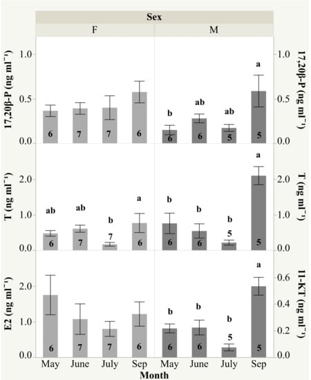 Female plasma 17β-estradiol (E2) levels were high at the beginning of the spawning period (May), although with elevated individual variability, as indicated by the high values of SEM, and showed a declining trend in the following months (Figure 9). Testosterone in the females was low throughout the spawning season and increased significantly (p < 0.05) at the final sampling. Plasma 17,20β–P remained below 1 ng mL−1 during the spawning period. In males, both plasma testosterone (T) and 11-keto testosterone (11-KT) levels followed a decreasing trend from May to July, while they increased significantly in September (p < 0.05). Also, 17,20β-dihydroxy-4-pregnen-3-one (17,20β-P) followed almost the same pattern throughout the spawning season, with the highest detected levels in September.