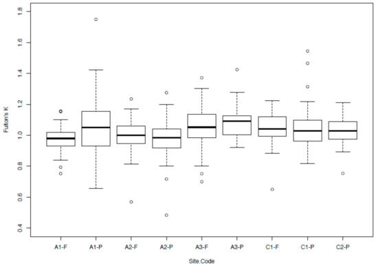 Box plots of Fulton’s k for Oncorhynchus mykiss sampled across nine headwater sites from Central Chile.