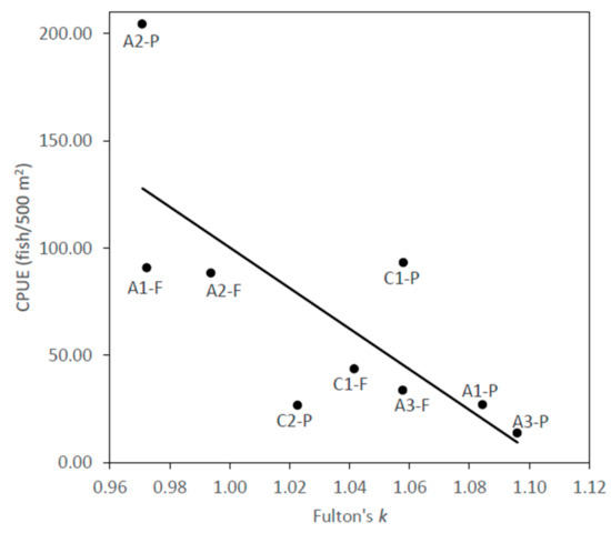 To generate the trout body condition index to examine the strength of self-regulation of trout populations, body condition (k) for O. mykiss was determined using the equation k = (W/TL3) × 100. The statistical significance and predictive strength were then compared against CPUE [43]. Catch per unit effort (CPUE) (n/500 m2) was calculated by using the estimated abundances for each sampling site [58] and then standardizing them to a constant area, based on field surveys [50]. All statistical assessments were conducted in R [59].