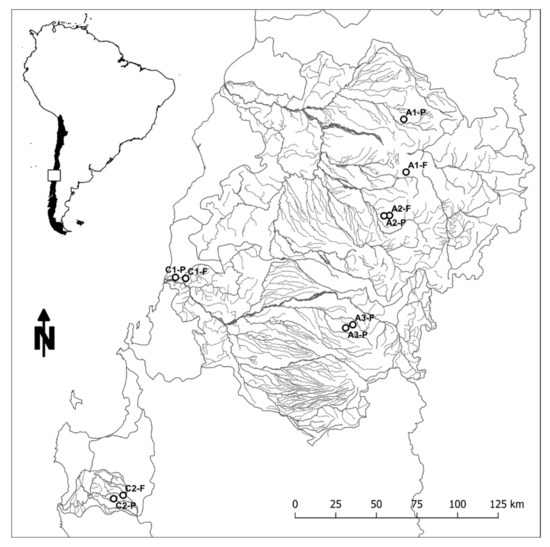 Throughout the Southern Hemisphere, trout species were introduced for sport fishing purposes from the end of the 19th Century and through to the 20th Century [5] and have become invasive in many countries, including Argentina, Australia, South Africa, India and Vietnam. In Chile, trout were introduced for sport fishing in 1890 [6], and presently, brown trout (Salmo trutta) or rainbow trout (Oncorhynchus mykiss) can be found in the mountainous reaches of all of Chile’s perennially flowing rivers [7], with trout displaying a seasonal range expansion and contraction that follows water temperature in Mediterranean climate river systems [8]. Since their introduction to Chile, trout have successfully outcompeted native fishes through habitat exclusion [9,10] and predation [11], decimating a freshwater fish fauna characterized by low diversity (46 species across the entire country), high endemism [7] and high levels of endangerment (all but three species listed as vulnerable or endangered) [12], with several species being the sole existing member of an entire family, such as Nematogenys inermis, the Chilean mountain catfish.