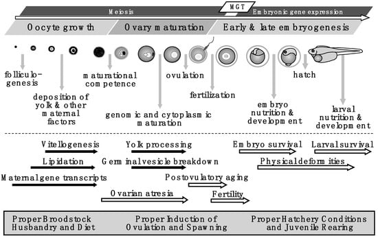 Model depicting the summary of processes and events during oocyte growth, ovary maturation, and early and late embryogenesis in fishes. Vertical grey arrows indicate critical physiological events, horizontal black arrows indicate important processes, and open arrows indicate potential problems or evaluations of egg quality. These topics are detailed in corresponding sections of this review and the figure has been compiled from several studies including those on: folliculogenesis, vitellogenesis, lipidation, and yolk processing [5,6,7,8,9,10,11,12,13,14,15,16,17,18,19,20,21,22,23,24,25,26,27,28,29,30,31,32,33,34,35,36,37,38,39,40,41]; maternal gene transcripts [2,3,4,42,43,44,45,46,47,48,49,50,51]; maturational competence, germinal vesicle breakdown, cytoplasmic maturation, and ovulation [15,25,26,30,31,35,52,53,54,55,56,57]; ovarian atresia (including broodstock stress) [52,48,58,59,60,61,62,63,64,65,66,67,68,69,70]; postovulatory aging [48,71,72,73,74,75,76,77,78,79,80,81,82,83,84,85]; and methods of evaluating egg quality including fertility, embryo survival, larval survival, and incidence of physical deformities [3,42,43,45,46,47,48,49,50,51,86]. Proper broodstock husbandry and diet, conditioning for spawning, ovulation, fertilization, and hatchery conditions are required to produce high quality eggs, see also: [1,3,52,53,15,25,58,87,88,89,90,91,92,93,94,95,96,97,98,99,100,101,102,103,104,105,106,107,108,109,110,111,112,113,114,115,116,117,118,119,120,121,122,123,124,125,126,127,128,129,130,131]. MGT = translation of maternal gene transcripts.