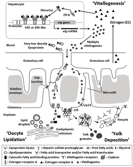 Model of oogenesis depicting ‘Oocyte Lipidation’, which occurs during previtellogenesis and ‘Yolk Deposition’, which occurs during ‘Vitellogenesis’. Circulating very low density lipoprotein is processed by lipoprotein lipase anchored to heparin sulfate proteoglycan within the ovarian follicle cell layer. Free fatty acids then cross over the oolemma escorted by fatty acid transporter and/or fatty acid translocator proteins where they are transferred to the endoplasmic reticulum by cytosolic fatty acid binding proteins located in the ooplasm. Free fatty acids are then re-esterfied and stored within lipid droplets or inclusions located throughout the ooplasm (Oocyte Lipidation). Estrogen (E2) produced by the ovarian follicle granulosa circulates to the liver where it enters into hepatocytes and binds an estrogen receptor. The estrogen receptors dimerize and bind estrogen response elements (EREs) or ERE-like sequences in the gene promoter regions to initiate transcription of multiple types of vitellogenins (Vitellogenesis). Vitellogenin gene transcripts are translated and mature particles are secreted into the blood where they travel to the ovary and bind specific membrane vitellogenin receptors (Lr8 and Lrp13). Vitellogenin receptors cluster into clathrin coated vesicles that are endocytosed and vitellogenins are processed into yolk proteins for storage in yolk granules located throughout the ooplasm (Yolk Deposition). The figure summarizes data from: [5,6,7,8,9,10,11,12,13,14,15,16,17,18,19,20,21,22,25,28,29,30,31,134].