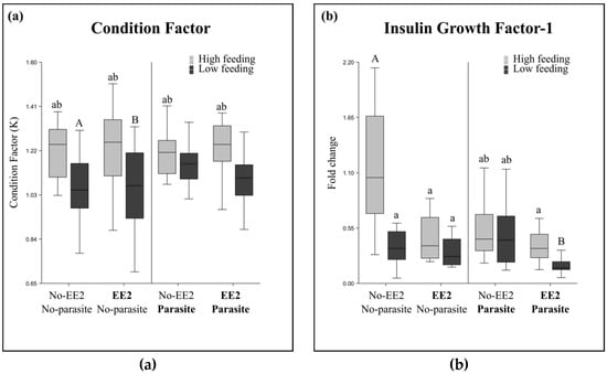 | EE2 Exposure | Parasitic Infection | EE2 Exposure x Parasitic Infection | Feeding Level | EE2 Exposure x Feeding Level | Parasitic Infection x Feeding level | EE2 Exposure x Parasitic Infection x Feeding Level | |||||||||||||||