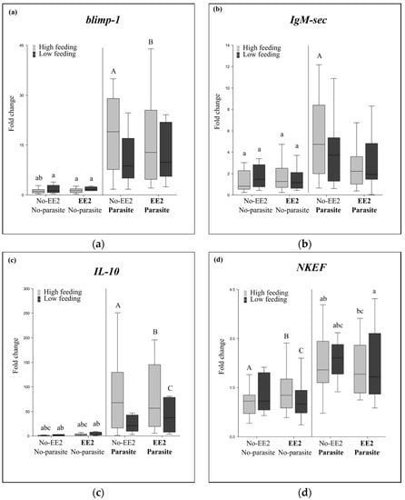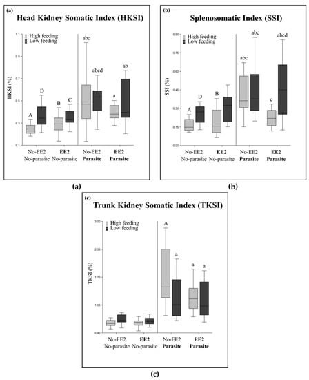 | Parasitic infection | Immune parameters | Head kidney somatic index, trunk kidney somatic index, splenosomatic index, expression of immune genes |