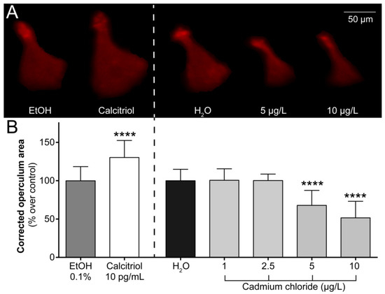 Effect of cadmium on the operculum growth during zebrafish development. (A) Fluorescence pictures of the operculum of 6-days post-fertilization (dpf) larvae exposed for 3 days to 10 pg/mL of calcitriol, 5 and 10 µg/L of cadmium chloride, or respective vehicles, and stained with alizarin red S (AR-S). Background was removed using image processing software to highlight operculum structure. (B) Area of the operculum determined through morphometric analysis of AR-S stained larvae and corrected by the area of the head. Ethanol and water were used as vehicles for calcitriol and cadmium chloride, respectively. Asterisks indicate values statistically different from vehicle values (one-way ANOVA followed by Dunnett’s multiple comparison test for water and cadmium; Student’s t test for ethanol and calcitriol (**** p < 0.0001)). Values are presented as percentages over controls and are the mean ± standard deviation (n ≥ 11).