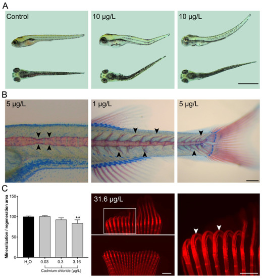 Effects of cadmium on skeletal structures during zebrafish development. (A) Bright-field pictures showing vertebral column curvatures in 6-dpf zebrafish larvae exposed for 3 days to 10 µg/L of cadmium chloride. Lateral (top row) and dorsal (bottom row) views of control (left panel) and cadmium-exposed (middle and right panels) fish. Bar is 1 mm. (B) Bright-field pictures illustrating the malformations observed in 20-dpf zebrafish post-larvae exposed for 20 days to 1 or 5 µg/L of cadmium chloride. Larvae were double stained with alcian blue and alizarin red S. Black arrowheads indicate deformed skeletal structures. Left panel, abdominal and caudal vertebrae compression (platyspondyly); Middle panel, malformation of the caudal vertebrae including neural and hemal arches; Right panel, malformation of the last neural and penultimate hemal arches. Bar is 0.5 mm. (C) Impaired bone regeneration in adult zebrafish exposed for 5 days to cadmium chloride determined from the morphometric analysis of fluorescence pictures of alizarin red S stained caudal fin (left panel). Asterisks indicate values statistically different from vehicle values (one-way ANOVA followed by Dunnett’s multiple comparison; ** p < 0.01). Values are presented as percentages and are the mean ± standard deviation (n ≥ 3). Newly formed rays were bended at the highest cadmium concentration (31.6 µg/L; middle panel). White arrowheads indicate bended lepidotrichia (right panel). Bar is 1 mm.