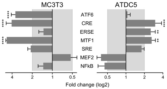 Activity of signaling pathways altered upon exposure of mineralogenic cell lines MC3T3-E1 and ATDC5 to cadmium chloride. Signaling activities were inferred from firefly and Renilla luciferase activities measured in cells reverse-transfected by reporter constructs of the CIGNAL 45-pathway array and exposed to water (vehicle) or 1 µM of cadmium chloride. Results are presented as fold changes of luciferase values in treated versus control cells. Asterisks indicate values statistically different according to one-way ANOVA followed by Dunnett’s multiple comparison test (** p < 0.01; **** p < 0.0001); Values are presented as the mean ± standard deviation (n = 3).