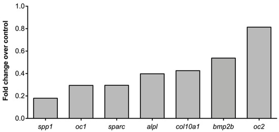 Gene expression in zebrafish post-larvae exposed for 20 days to 1 µg/L of cadmium chloride. spp1, osteopontin; oc1, osteocalcin 1; sparc, osteonectin; alpl, alkaline phosphatase liver/bone/kidney; col10a1, collagen type X alpha 1 chain; bmp2b, bone morphogenetic protein 2b; oc2, osteocalcin 2. Values are presented as fold change over control (expression in larvae exposed to vehicle; set to 1 for all genes) and are the mean of 3 technical replicates performed in pools of more than 25 post-larvae.