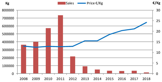 Sales and prices evolution of wreckfish in the Galician market from 2008 to 2018 [8].