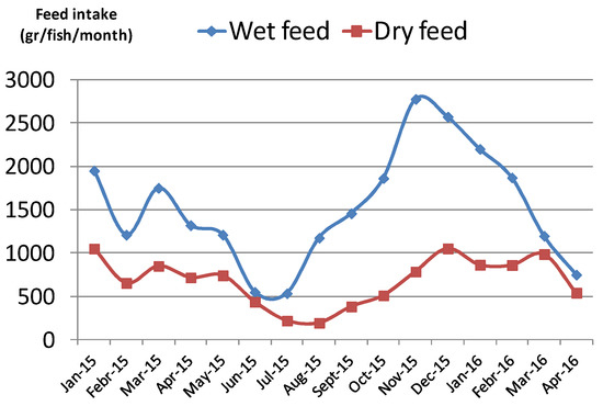 Mean feed intake (gr/fish/mounth) of the indoor Instituto Español de Oceanografía broodstocks during 2015.