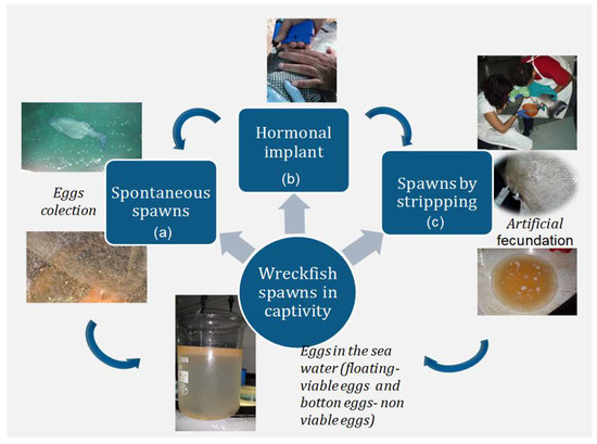 It could be possible to apply the method of artificial spawning by stripping in wreckfish only with mature females that exhibit problems of spontaneous spawns after GnRHa induction but not for females that undergo oocyte maturation naturally, because the adult fishes are large and heavy and the stress caused by handling resulted in problems with egg quality and fertilization success.