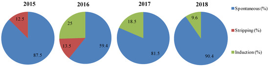 Percentage of spontaneous, artificial (by stripping), and GnRHa-induced spawns during 2015–2018 in the three Galician wreckfish broodstock.