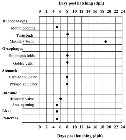 Schematic representation of the main structures of the digestive system identified. The time of appearance of each structure is presented with a black solid circle as a function of days post hatching (dph, horizontal axis).