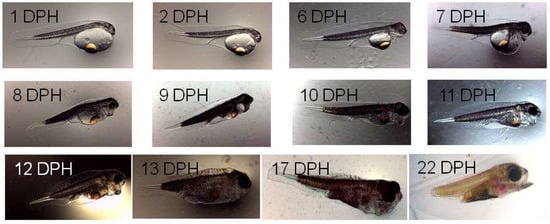 In wreckfish, the ontogenesis of the digestive system was considered a slow procedure in comparison with other species. The development of the digestive system was controlled by endogenous factors and generally it was genetically programmed, but the time of appearance of the digestive system structures could be influenced by a number of exogenous factors, with temperature being one of the most important [35]. The ontogenesis of the organs related to the digestive and the vision system was not completed until 23 dph (Figure 6).