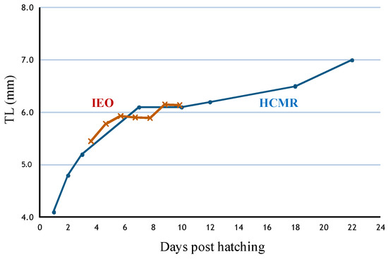 Total length curves (TL, mm) for Instituto Español de Oceanografía-IEO (11 dph) and Hellenic Center for Marine Research-HCMR (22 dph) larvae.