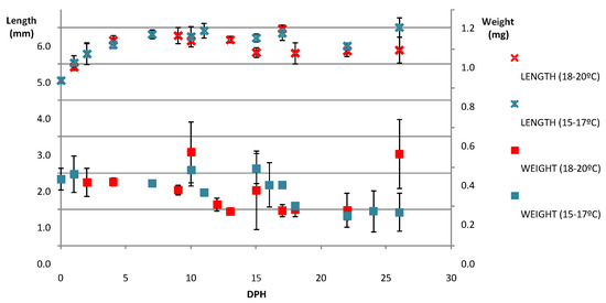 No statistical differences (p > 0.05) in size or weight were observed in the larval growth at different temperatures (Figure 9).