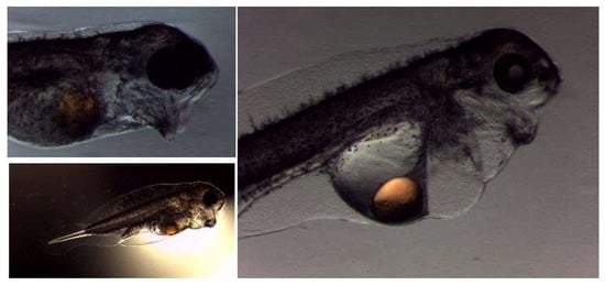 Some malformed individuals were observed in the rearing trials (Figure 10). The problem was identified as similar to a syndrome related to swollen yolk sac (SYSS) described in Murray cod (freshwater fish in Australia), that it is related to inadequate nutrition of the broodstock [43]. Furthermore, similar appearance has been also described in the Blue Sac Disease that is common in trout [44]. Toxicity from nitrogen compounds such as ammonia or oxidative stress have been suggested to play an important role in the appearance of this type of deformity. A situation of SYSS could be happening in wreckfish larvae but further studies are required to confirm this conclusion.