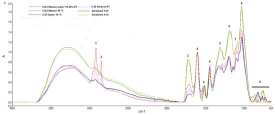 Figure 1 shows the ATR-FTIR spectra obtained from CSEs and two commercial samples of chestnut wood (Silvafeed® TSP and ATX). Table 3 shows the frequency assignments of the functional groups. Peaks identification and their assignment were based on literature data [23,24,25]. The broad spectrum of absorption at 3300–2500 cm−1 was due to the OH groups of the carboxylic acids. The peaks at 2918 and 2850 cm−1 were due to CH2 stretching of the aliphatic hydrocarbons. In the region between 1727 and 1700 cm−1, the C–O stretching of esters of hydrolyzable tannins, especially derivatives of gallic acid, can be seen. The intense band at 1604–1607 cm−1, and the less intense bands at 1550–1520 and 1443–1447 cm−1, were due to the stretching of the bond of C=C of the aromatic rings. The stretching of the C–O bond is visible at 1342–1308 cm−1. Aliphatic C=O stretching can be seen in the regions 1174–1198 cm−1 and 1029–1035 cm−1. From 913 to 666 cm−1, there is a region of C–H deformation out of the plane, predominantly with signals of low intensities.
