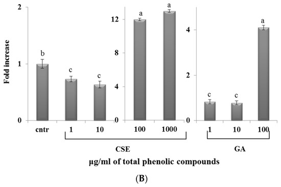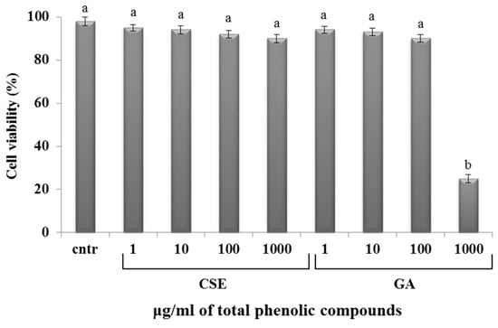 Percentage of cell viability. The data represent the mean ± SD of triplicate cultures (n = 3). Different letters on the columns indicate statistically significant differences (cntr = control). The concentration reported on the x axis refers to the total phenolic compounds contained in the chestnut shell extract (CSE). The graph is representative of both blood and intestinal cell cultures.