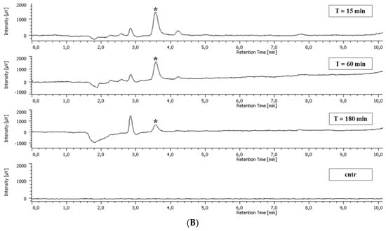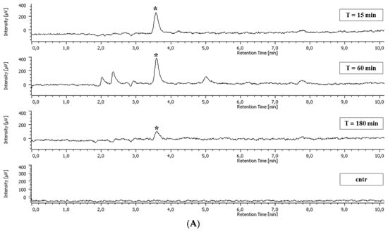 Representative chromatograms showing the resolution of the methanol extract of intestinal intraepithelial non-adherent leukocytes (A) incubated with chestnut shell extract (CSE) and blood non-adherent leukocytes (B) incubated with gallic acid (GA) for 15, 60, and 180 min. The control was the cellular sample incubated in the absence of CSE. Asterisks represent the GA peak (retention time = 3.59 min).