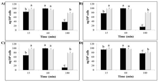 Cellular content of chestnut shell extract (CSE) (10 µg/mL) and GA (10 µg/mL) in blood non-adherent leukocytes and intestinal intraepithelial non-adherent leukocytes after 15, 60, and 180 min of incubation (black columns) and CSE and GA concentration in the medium after different incubation times (white columns). (A) and (B) CSE and GA content in intestinal intraepithelial non-adherent leukocytes, respectively; (C) and (D) CSE and GA content in blood non-adherent leukocytes, respectively. CSE concentration is expressed as ng/106 cells. The data represent mean ± SD. Different letters on the columns indicate statistically significant differences.