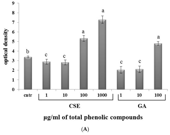 In both blood and intestinal non-adherent leukocytes, low doses of CSE (1 and 10 µg/mL) and GA (1 and 10 µg/mL) decreased the production of superoxide anion compared to the control. At high doses of CSE (100 and 1000 µg/mL) and GA (100 µg/mL), the production of superoxide anion increased (Figure 5).