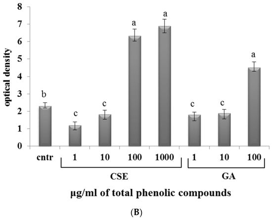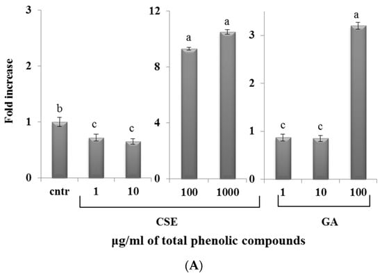 Total polyphenol content was determined by the Folin–Ciocalteu method [72,73]. Folin–Ciocalteu reagent (2.5 mL) previously diluted with water (1:10, v/v) and 2 mL of a 75-g/L aqueous solution of sodium carbonate were added to 0.5 mL of an aqueous solution of the CSE. The mixture was kept for 5 min at 50 °C and, after cooling, the absorbance at 760 nm was measured. Total polyphenol content was calculated as the GA equivalent (GAE) from the calibration curve of GA standard solutions (2–40 g/mL) and was expressed as GAE/mg of extract (on a dry basis). The analyses were done in triplicate, and the mean value was calculated.