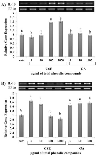 IL-1β mRNA expression in response to different doses of CSE and GA in in vitro incubations of intestinal intraepithelial non-adherent leukocytes (A) and blood non-adherent leukocytes (B) of rainbow trout. The data represent the mean ± SD of different fish samples (n = 9). Different letters on the columns indicate statistically significant differences (cntr = control). The housekeeping gene was EF1α. The concentration reported on the x axis refers to the total phenolic compounds contained in the chestnut shell extract (CSE).