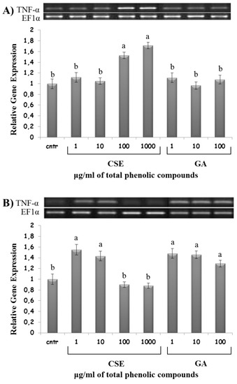 TNF-α mRNA expression in response to different doses of CSE and GA in in vitro incubations of intestinal intraepithelial non-adherent leukocytes (A) and blood non-adherent leukocytes (B) of rainbow trout. The data represent the mean ± SD of different fish samples (n = 9). Different letters on the columns indicate statistically significant differences (cntr = control). The housekeeping gene was EF1α. The concentration reported on the x axis refers to the total phenolic compounds contained in the chestnut shell extract (CSE).