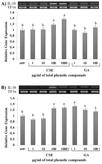 IL-10 mRNA expression in response to different doses of CSE and GA in in vitro incubations of intestinal intraepithelial non-adherent leukocytes (A) and blood non-adherent leukocytes (B) of rainbow trout. The data represent the mean ± SD of different fish samples (n = 9). Different letters on the columns indicate statistically significant differences (cntr = control). The housekeeping gene was EF1α. The concentration reported on the x axis refers to the total phenolic compounds contained in the chestnut shell extract (CSE).