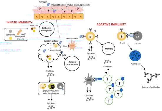 The general mechanism of immune response in the mucosal surfaces involves the concerted action of physical barriers, i.e., mucus, scales, and epithelium, which orchestrate the first line of defense by trapping and by direct elimination of pathogens (Figure 1). Once the pathogenic organism manages to infiltrate the physical barriers, pattern recognition receptors (PRR) of immune cells detect pathogenic agents through their pathogen-associated molecular patterns, triggering the innate immune system. Antigen uptake can have different pathways: (a) start of the inflammatory process brought about by the release of cytokine mediators and attractants corresponding to the type of cell and (b) presentation of the antigen that activates the action of antigen-specific lymphocytes that contain receptors which recognize specific molecules, characteristic of each pathogen. This elicits secondary responses, including processes involved in adaptive immunity [6].