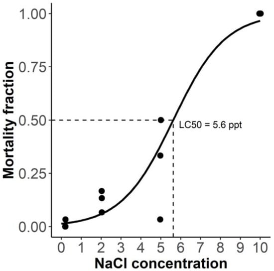 Concentration–response relationship between salinity (salt concentration in parts per thousand) and embryo mortality % after 24 h of exposure beginning from <2 h post-fertilisation. N = 3 dishes of 30 embryos per treatment level, with each point representing a single dish. Curve fit and predicted LC50 were obtained using a generalised linear model.