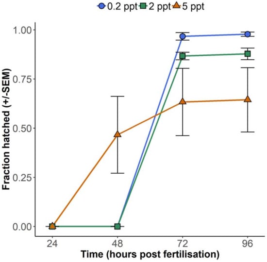 Although 5 ppt resulted in fewer embryos hatched at 72 hpf, embryos reared at this concentration hatched earlier than their lower salinity counterparts. Hatching at 0.2 and 2 ppt was not observed until 72 hpf, while most of the surviving embryos exposed to 5 ppt hatched 24 h earlier than at these lower concentrations, at 48 hpf (Figure 2). For statistical evaluation of the interaction between concentration and hatching time, a linear mixed model was fitted, which accounted for repeated measures from the same dishes. This model showed a significant interaction between 5 ppt salinity and time (t-test with Kenward Roger approximation of degrees of freedom, T24 = 2.1, p = 0.045).