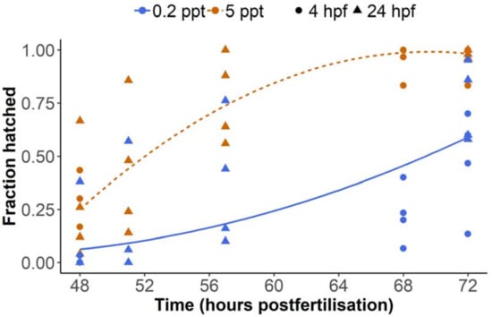 Proportion of zebrafish embryos hatched between 48- and 72-h post-fertilisation while exposed to salt concentrations of 0.2 (blue) or 5 ppt (orange) in petri dishes at 25 °C, beginning from either 4 hpf (circles) or 24 hpf (triangles) depending on the experiment. N = 8 dishes of 30 embryos per salt concentration, with each point representing a single dish. Curve fits derived from a linear mixed effects model (time as quadratic term).